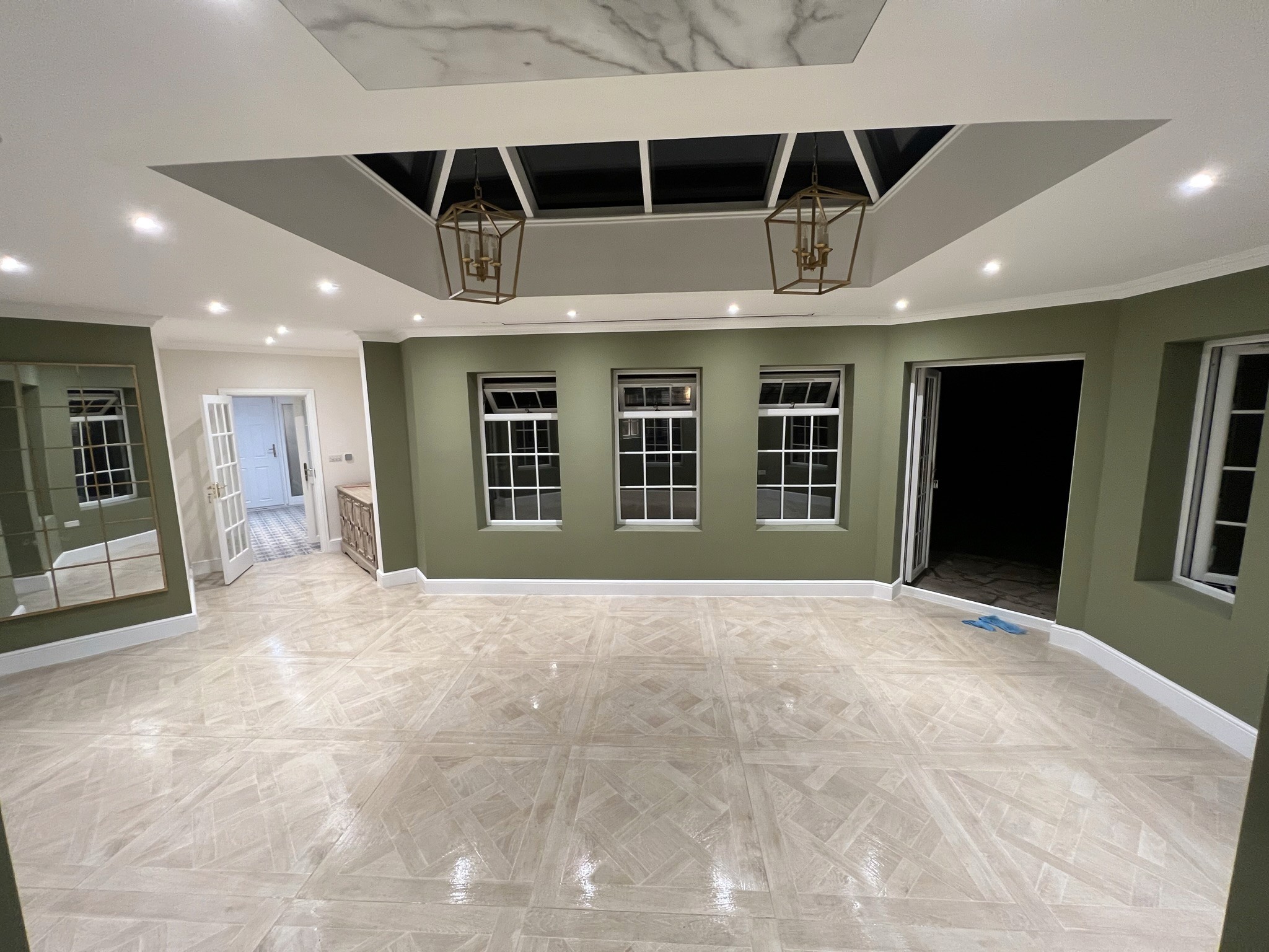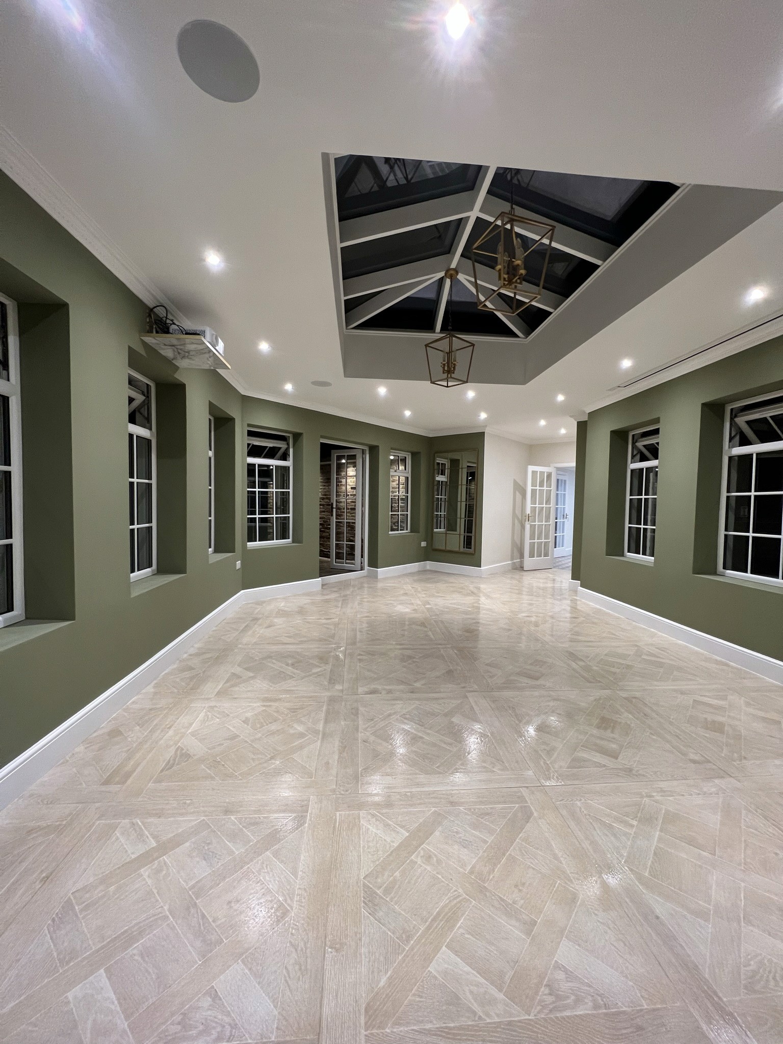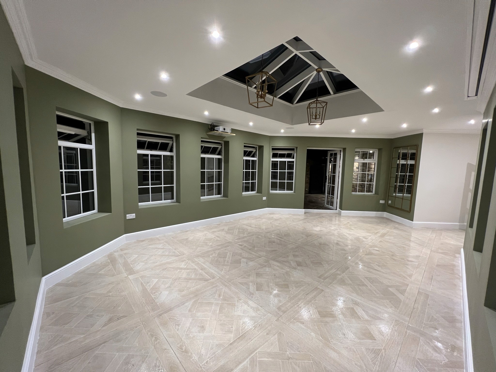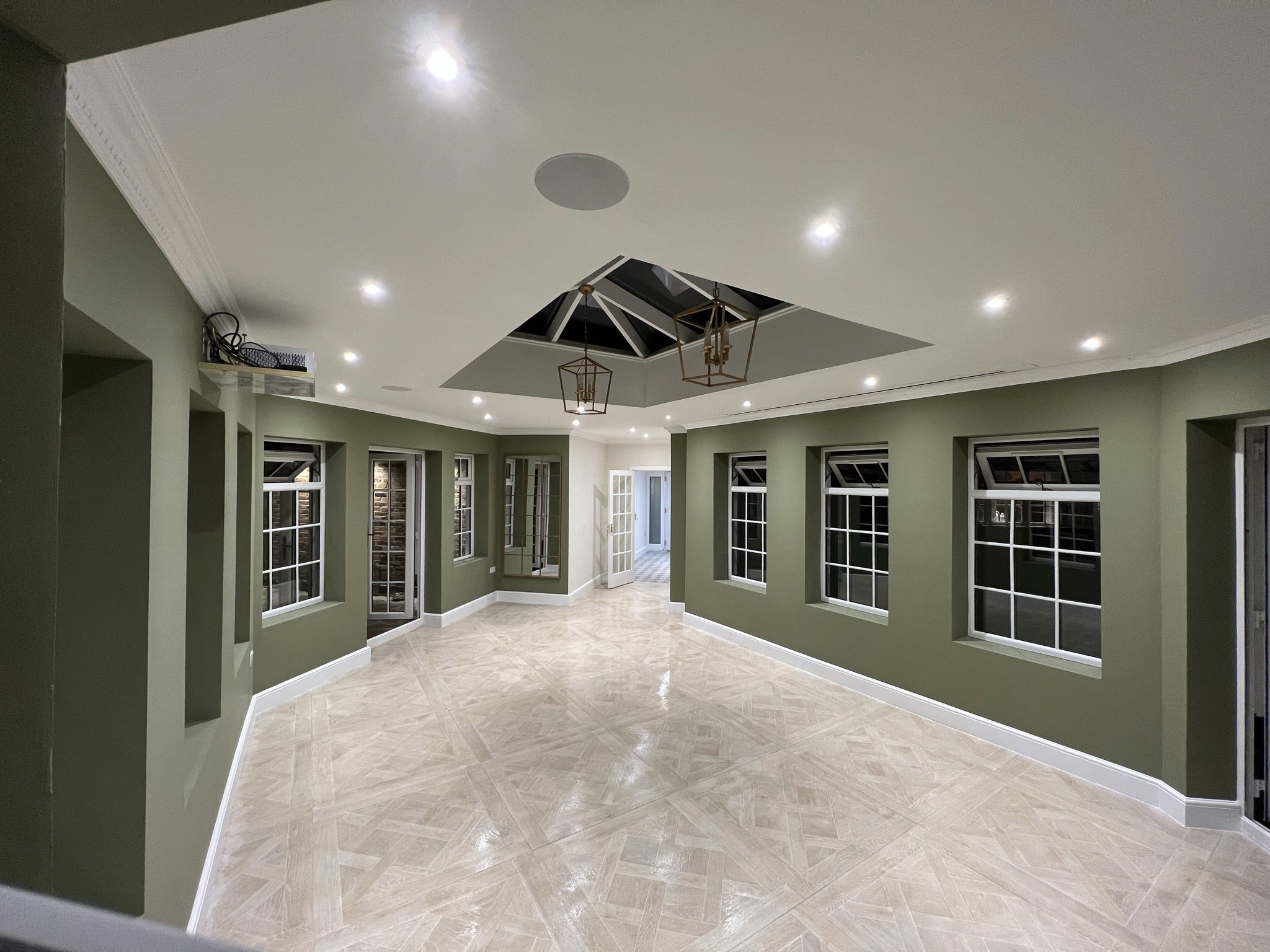 A bespoke lantern, Victorian-style windows, garden double doors, partial rewiring, ceiling-mounted projector/screen/speakers, and wet underfloor heating enhanced functionality. Dry linings, large-format tiling, resin flooring, new skirtings/architraves/doors, bespoke automatic garage door, walnut joinery, and internal/external decorating completed the aesthetics.