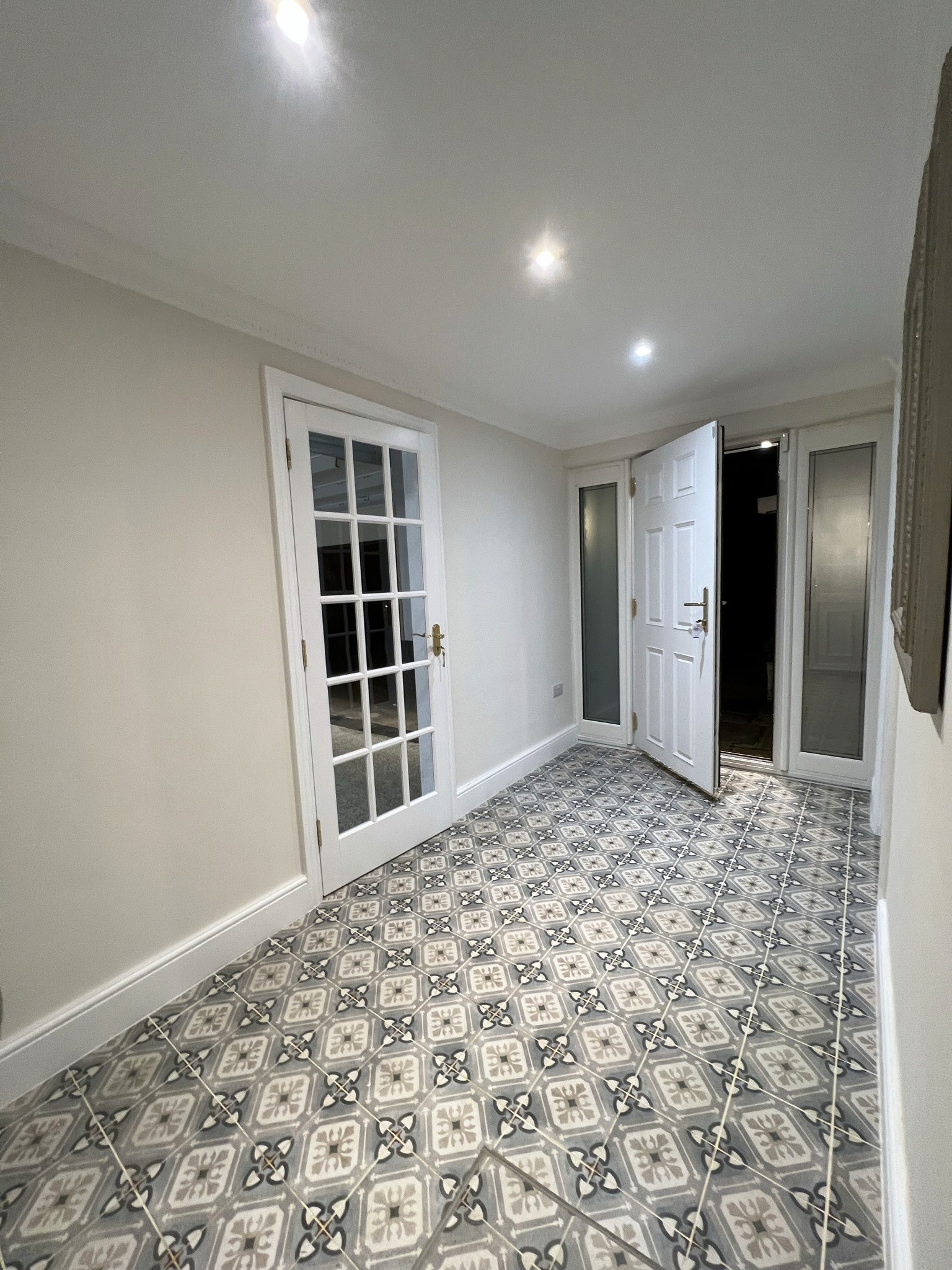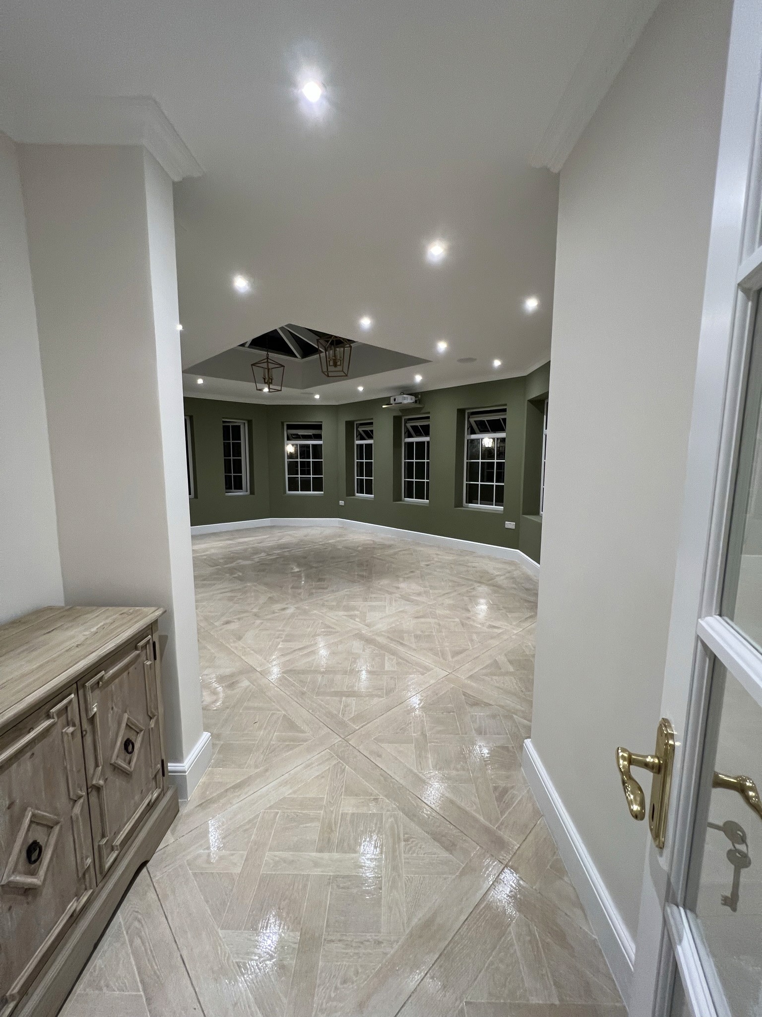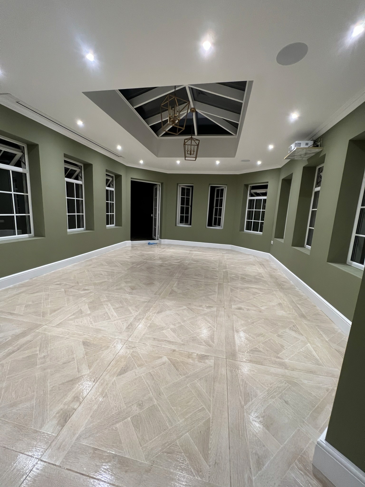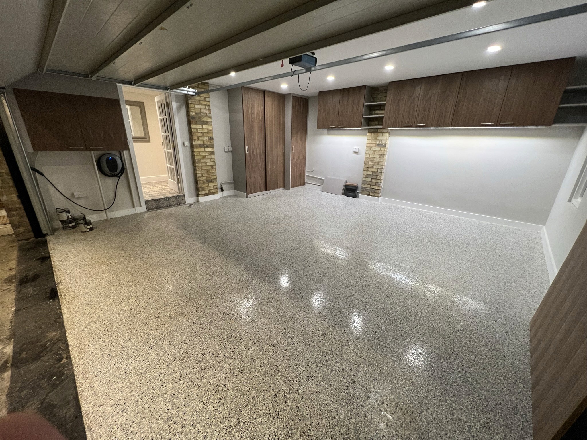 A bespoke lantern, Victorian-style windows, garden double doors, partial rewiring, ceiling-mounted projector/screen/speakers, and wet underfloor heating enhanced functionality. Dry linings, large-format tiling, resin flooring, new skirtings/architraves/doors, bespoke automatic garage door, walnut joinery, and internal/external decorating completed the aesthetics.